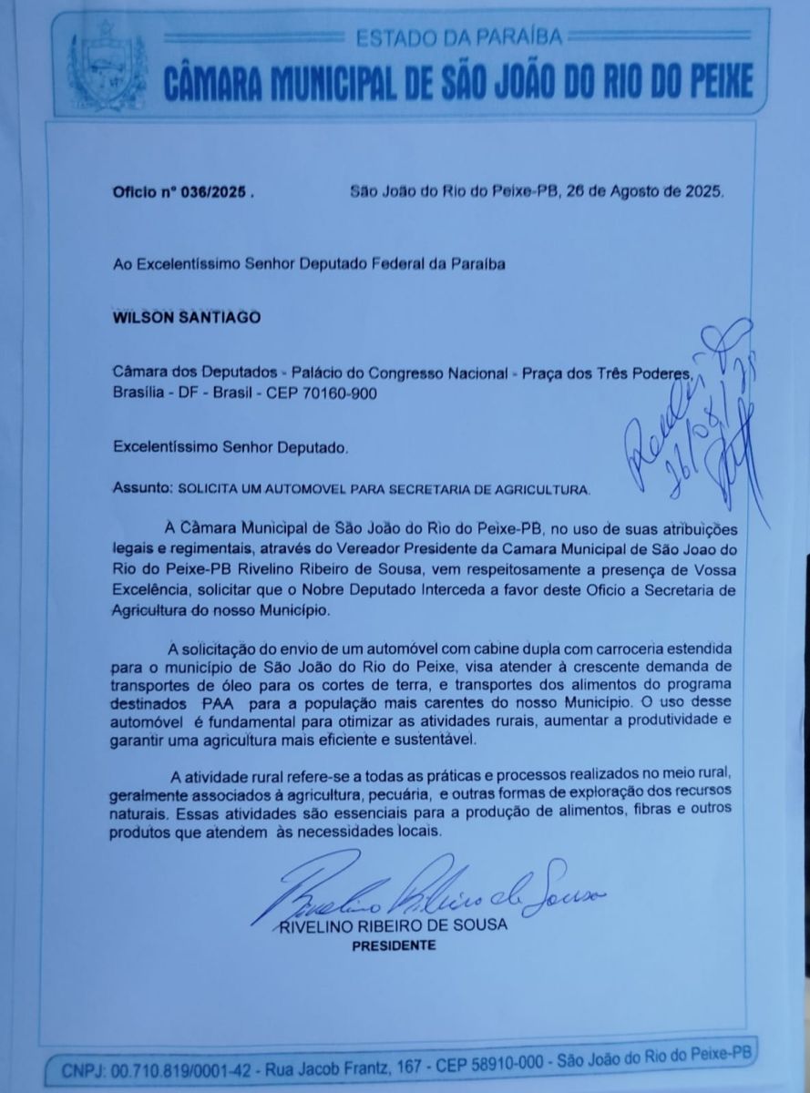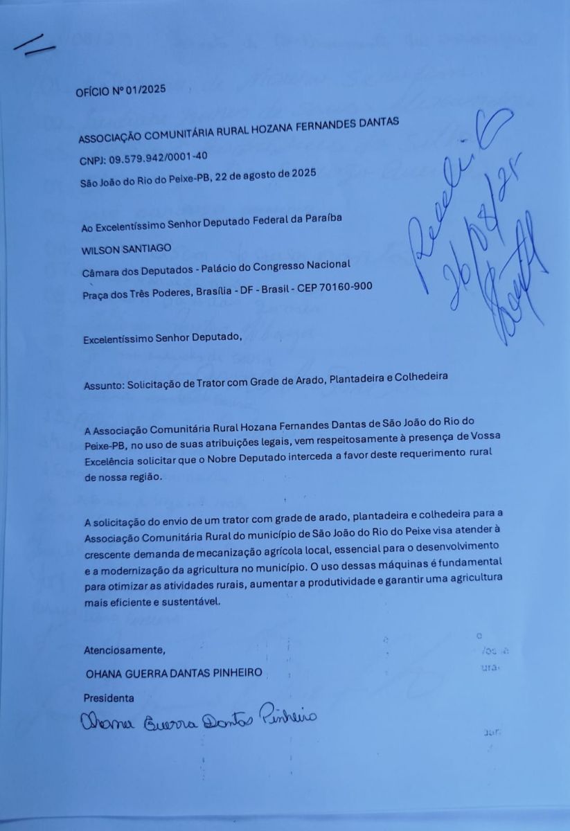 O vereador também protocolou, por meio do Ofício nº 001/2025, o pedido de um trator equipado com grade de arado, plantadeira e colheitadeira, em nome da Associação Comunitária Rural Ohana Guerra Dantas Pinheiro. O equipamento tem como objetivo fortalecer a agricultura familiar, ampliando o suporte à produção e melhorando as condições de trabalho no campo.