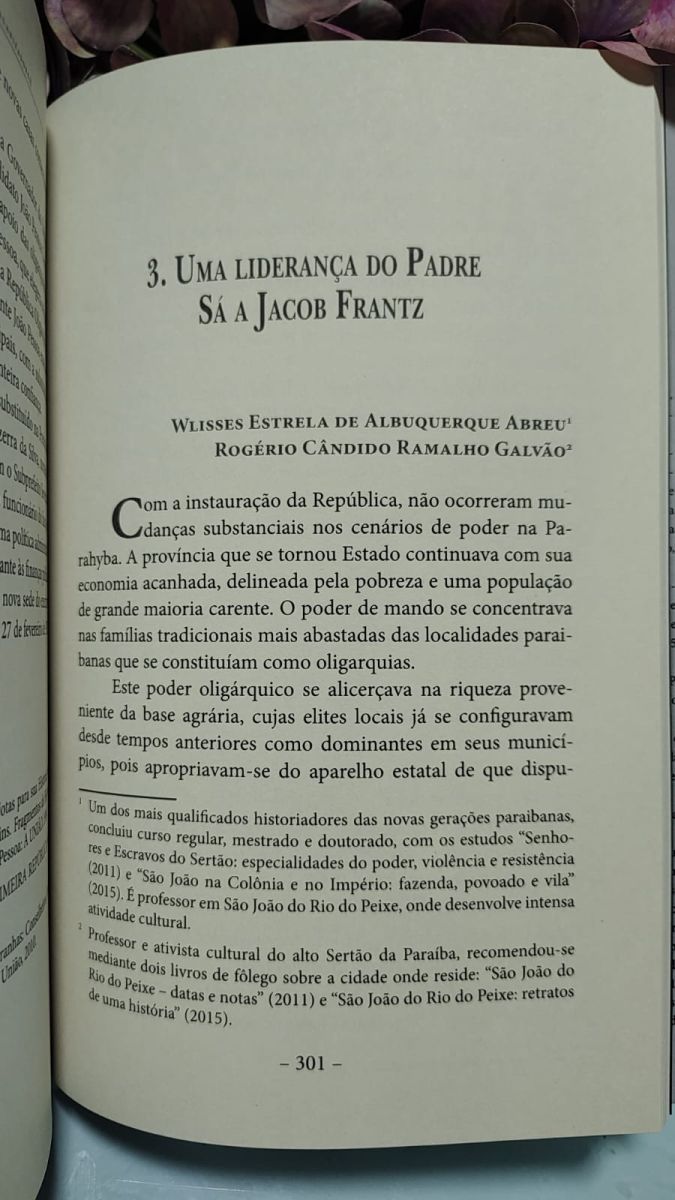 Os historiadores Wlisses Estrela e Rogério Galvão assinam um dos capítulos do livro "A Revolução de 30 nos municípios da Paraíba", lançado neste ano em que o movimento completa 95 anos. O artigo, intitulado "Uma liderança do Padre Sá a Jacob Frantz", analisa o impacto da Revolução de 1930 em São João do Rio do Peixe.