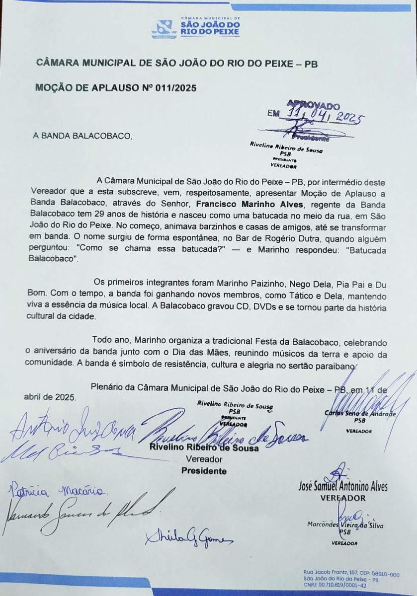 A Câmara Municipal de São João do Rio do Peixe, no Sertão paraibano, concedeu uma Moção de Aplauso à Banda Balacobaco, em reconhecimento à sua contribuição cultural e musical ao município. A iniciativa partiu do vereador e presidente da Casa Legislativa, Riva, e foi direcionada ao regente do grupo, o senhor Francisco Marinho Alves.